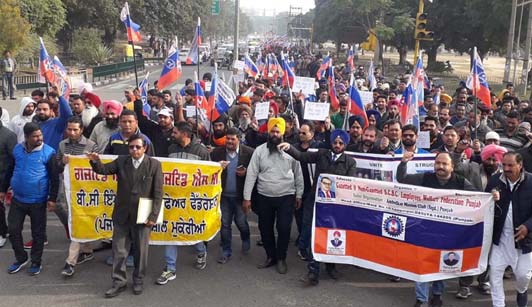 Share on Facebook Share on Twitter Share on Google+ Share on Pinterest Share on Linkedin 85ਵੀਂ ਸੋਧ ਤੇ ਕੈਪਟਨ ਸਰਕਾਰ ਦੀ ਦਲਿਤ ਵਿਰੋਧੀ ਨੀਤੀਆਂ ਖ਼ਿਲਾਫ਼ ਪੰਜਾਬ ਵਿਧਾਨ ਸਭਾ ਵੱਲ ਕੂਚ ਮੁਹਾਲੀ-ਚੰਡੀਗੜ੍ਹ ਦੀ ਸਾਂਝੀ ਹੱਦ ’ਤੇ ਯੂਟੀ ਪੁਲੀਸ ਨੇ ਪ੍ਰਦਰਸ਼ਨਕਾਰੀਆਂ ਦਾ ਰਾਹ ਡੱਕਿਆ, ਚੱਕਾ ਜਾਮ ਕਰਕੇ ਧਰਨੇ ’ਤੇ ਬੈਠੇ ਮੁਜ਼ਾਹਰਾਕਾਰੀ ਜਾਇਜ਼ ਮੰਗਾਂ ਮੰਨਣ ਲਈ ਸਰਕਾਰ ਨੂੰ 7 ਦਿਨ ਦਾ ਅਲਟੀਮੇਟਮ, ਮੰਤਰੀਆਂ ਤੇ ਵਿਧਾਇਕਾਂ ਦਾ ਘਿਰਾਓ ਕਰਨ ਦੀ ਧਮਕੀ ਨਬਜ਼-ਏ-ਪੰਜਾਬ ਬਿਊਰੋ, ਮੁਹਾਲੀ, 4 ਫਰਵਰੀ: ਗਜ਼ਟਿਡ ਅਤੇ ਨਾਨ ਗਜ਼ਟਿਡ ਐਸਸੀ/ਬੀਸੀ ਐਂਪਲਾਈਜ ਵੈਲਫੇਅਰ ਫੈਡਰੇਸ਼ਨ ਦੇ ਚੇਅਰਮੈਨ ਜਸਬੀਰ ਸਿੰਘ ਪਾਲ ਅਤੇ ਡਾ. ਅੰਬੇਦਕਰ ਮਿਸ਼ਨ ਕਲੱਬ ਪੰਜਾਬ ਦੇ ਪ੍ਰਧਾਨ ਬਲਰਾਜ ਕੁਮਾਰ ਦੀ ਅਗਵਾਈ ਹੇਠ ਪੰਜਾਬ ਭਰ ’ਚੋਂ ਮੁਹਾਲੀ ਪਹੁੰਚੇ ਦਲਿਤ ਪਰਿਵਾਰਾਂ, ਐਸਸੀ/ਬੀਸੀ ਮੁਲਾਜ਼ਮਾਂ ਅਤੇ ਅਧਿਆਪਕਾਂ ਨੇ ਕੈਪਟਨ ਸਰਕਾਰ ਦੀਆਂ ਦਲਿਤ ਵਿਰੋਧੀ ਨੀਤੀਆਂ ਦੇ ਖ਼ਿਲਾਫ਼ ਸੂਬਾ ਪੱਧਰੀ ਰੋਸ ਮੁਜ਼ਾਹਰਾ ਕੀਤਾ। ਪੰਜਾਬ ਦੇ ਵੱਖ ਵੱਖ ਸ਼ਹਿਰਾਂ ਅਤੇ ਪਿੰਡਾਂ ’ਚੋਂ ਦਲਿਤ ਵਰਗ ਦੇ ਲੋਕ ਅਤੇ ਮੁਲਾਜ਼ਮ ਸਵੇਰੇ 10 ਵਜੇ ਹੀ ਦੁਸਹਿਰਾ ਗਰਾਉਂਡ ਫੇਜ਼-8 ਵਿੱਚ ਪਹੁੰਚਣੇ ਸ਼ੁਰੂ ਹੋ ਗਏ ਅਤੇ ਦੁਪਹਿਰ 1 ਵਜੇ ਵੱਡੀ ਭੀੜ ਜਮ੍ਹਾ ਹੋ ਗਈ। ਇੱਥੇ ਵੱਖ ਵੱਖ ਬੁਲਾਰਿਆਂ ਨੇ ਹੁਕਮਰਾਨਾਂ ਨੂੰ ਕੋਸਦਿਆਂ ਸਰਮਾਏਦਾਰਾਂ ਦਾ ਪੱਖ ਪੂਰਨ ਦਾ ਦੋਸ਼ ਲਾਇਆ। ਇਸ ਮਗਰੋਂ ਦਲਿਤ ਵਰਗ ਦੇ ਮੁਲਾਜ਼ਮਾਂ ਨੇ ਪੰਜਾਬ ਵਿਧਾਨ ਸਭਾ ਦਾ ਘਿਰਾਓ ਕਰਨ ਲਈ ਮੁਹਾਲੀ ਦੀਆਂ ਸੜਕਾਂ ’ਤੇ ਵਿਸ਼ਾਲ ਰੋਸ ਮਾਰਚ ਕਰਦਿਆਂ ਚੰਡੀਗੜ੍ਹ ਵੱਲ ਕੂਚ ਕਰ ਦਿੱਤਾ। ਹਾਲਾਂਕਿ ਪੁਲੀਸ ਵੱਲੋਂ ਵਾਈਪੀਐਸ ਚੌਂਕ ਨੇੜੇ ਮੁਜ਼ਾਹਰਾਕਾਰੀਆਂ ਨੂੰ ਰੋਕਣ ਦੀ ਕੋਸ਼ਿਸ਼ ਕੀਤੀ ਗਈ ਪ੍ਰੰਤੂ ਉਹ ਪੁਲੀਸ ਦਾ ਸੁਰੱਖਿਆ ਘੇਰਾ ਤੋੜ ਕੇ ਅੱਗੇ ਵਧਣ ਵਿੱਚ ਕਾਮਯਾਬ ਰਹੇ। ਪ੍ਰੰਤੂ ਮੁਹਾਲੀ-ਚੰਡੀਗੜ੍ਹ ਦੀ ਸਾਂਝੀ ਹੱਦ ’ਤੇ ਪਹਿਲਾਂ ਤੋਂ ਹੀ ਤਾਇਨਾਤ ਯੂਟੀ ਪੁਲੀਸ ਨੇ ਬੈਰੀਕੇਟ ਲਗਾ ਕੇ ਪ੍ਰਦਰਸ਼ਨਕਾਰੀਆਂ ਦਾ ਰਾਹ ਡੱਕ ਲਿਆ। ਇਸ ਦੌਰਾਨ ਪੁਲੀਸ ਨਾਲ ਹਲਕੀ ਫੁਲਕੀ ਧੱਕਾ ਮੁੱਕੀ ਵੀ ਹੋਈ ਪਰ ਮੁਲਾਜ਼ਮ ਉੱਥੇ ਹੀ ਸੜਕ ਉੱਤੇ ਚੱਕਾ ਜਾਾਮ ਕਰਕੇ ਧਰਨਾ ਲਗਾ ਕੇ ਬੈਠ ਗਏ ਅਤੇ ਪੰਜਾਬ ਸਰਕਾਰ ਦਾ ਪਿੱਟ ਸਿਆਪਾ ਸ਼ੁਰੂ ਕਰ ਦਿੱਤਾ ਗਿਆ। ਉਨ੍ਹਾਂ ਮੰਗ ਕੀਤੀ ਕਿ 85ਵੀਂ ਸੰਵਿਧਾਨਕ ਸੋਧ ਲਾਗੂ ਕੀਤੀ ਜਾਵੇ ਅਤੇ ਦਸਵੀਂ ਅਤੇ ਬਾਰ੍ਹਵੀਂ ਦੇ ਦਲਿਤ ਵਿਦਿਆਰਥੀਆਂ ਦੀ ਪ੍ਰੀਖਿਆ ਫੀਸ ਵਾਪਸ ਕੀਤੀ ਜਾਵੇ ਅਤੇ ਦਲਿਤ ਵਿਦਿਆਰਥੀਆਂ ਦੇ ਵਜ਼ੀਫ਼ੇ ਤੁਰੰਤ ਦਿੱਤੇ ਜਾਣ। ਸਰਕਾਰੀ ਹਸਪਤਾਲਾਂ ਅਤੇ ਸਰਕਾਰੀ ਸਕੂਲਾਂ ਨੂੰ ਨਿੱਜੀ ਹੱਥਾਂ ਵਿੱਚ ਦੇਣ ਦਾ ਫੈਸਲਾ ਰੱਦ ਕੀਤਾ ਜਾਵੇ, ਬਜਟ ਦਾ 55 ਫੀਸਦੀ ਹਿੱਸਾ ਗਰੀਬ ਲੋਕਾਂ ਦੀਆਂ ਭਲਾਈ ਸਕੀਮਾਂ ’ਤੇ ਖਰਚ ਕੀਤਾ ਜਾਵੇ, ਵੱਖ ਵੱਖ ਵਿਭਾਗਾਂ ਵਿੱਚ ਕੰਮ ਕਰਦੇ ਕੱਚੇ ਮੁਲਾਜ਼ਮਾਂ ਨੂੰ ਮੌਜੂਦਾ ਤਨਖ਼ਾਹ ’ਤੇ ਪੱਕਾ ਕੀਤਾ ਜਾਵੇ। ਨਿੱਜੀ ਖੇਤਰ ਵਿੱਚ ਰਾਖਵਾਂਕਰਨ ਲਾਗੂ ਕੀਤਾ ਜਾਵੇ, 2017 ਤੋਂ ਬੇਰੁਜ਼ਗਾਰੀ ਭੱਤਾ 2500 ਰੁਪਏ ਤੁਰੰਤ ਦਿੱਤਾ ਜਾਵੇ। ਇਸ ਮੌਕੇ ਜਥੇਬੰਦੀ ਦੇ ਚੇਅਰਮੈਨ ਜਸਬੀਰ ਸਿੰਘ ਪਾਲ, ਬਲਰਾਮ ਕੁਮਾਰ, ਮਲਕੀਤ ਸਿੰਘ ਬਠਿੰਡਾ, ਕੁਲਵਿੰਦਰ ਸਿੰਘ ਹੁਸ਼ਿਆਰਪੁਰ, ਰਜਿੰਦਰ ਮੈਣੀ, ਹਰਦੀਪ ਸਿੰਘ ਮੁਹਾਲੀ, ਸੁਖਚਰਨ ਸਿੰਘ, ਡਾ. ਸੁਖਵਿੰਦਰ ਸਿੰਘ, ਡਾ. ਲਖਮੀਰ ਸਿੰਘ, ਮਨੋਹਰ ਲਾਲ ਫਰੀਦਕੋਟ, ਮਹਿੰਦਰ ਸਿੰਘ ਰੂਪਨਗਰ, ਸ਼ਿਵ ਸਿੰਘ ਬੰਗੜ, ਪ੍ਰਿੰਸੀਪਲ ਕ੍ਰਿਸ਼ਨ ਲਾਲ, ਰਾਮ ਆਸਰਾ ਅਤੇ ਹਰਮੇਸ਼ ਲਾਲ ਘੇੜਾ ਨੇ ਵੀ ਧਰਨੇ ਨੂੰ ਸੰਬੋਧਨ ਕੀਤਾ। ਧਰਨਾਕਾਰੀਆ