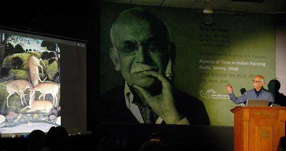 Internationally acclaimed art historian and thinker Professor B. N. Goswamy gave an audio visual presentation and Dr. M S Randhawa Memorial Lecture, on the theme of “Aspects of Time in Indian painting: Kaala, Samay, Waqt” at Punjab Kala Bhawan, Chandigarh on the invitation of Punjab Kala Parishad and Punjab Lalit Kala Akademi during the ongoing Dr. M. S. Randhawa Arts and Literature Festival 2018.