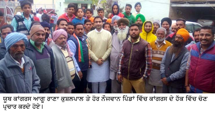 ਯੂਥ ਕਾਂਗਰਸ ਦੇ ਹਲਕਾ ਖਰੜ ਤੋਂ ਪ੍ਰਧਾਨ ਰਾਣਾ ਕੁਸ਼ਲਪਾਲ ਦੀ ਅਗਵਾਈ ਹੇਠ ਨੌਜਵਾਨਾਂ ਨੇ ਵੱਖ-ਵੱਖ ਟੋਲੀਆਂ ਬਣਾ ਕੇ ਖਰੜ ਤੋਂ ਕਾਂਗਰਸ ਦੇ ਉਮੀਦਵਾਰ ਜਗਮੋਹਨ ਸਿੰਘ ਕੰਗ ਦੇ ਹੱਕ ਵਿੱਚ ਘਰ-ਘਰ ਜਾ ਕੇ ਚੋਣ ਪ੍ਰਚਾਰ ਕੀਤਾ। ਇਸ ਦੌਰਾਨ ਯੂਥ ਕਾਂਗਰਸੀਆਂ ਨੇ ਇਲਾਕੇ ਦੇ ਲੋਕਾਂ ਨੂੰ ਅਕਾਲੀ-ਭਾਜਪਾ ਗੱਠਜੋੜ ਅਤੇ ਆਮ ਆਦਮੀ ਪਾਰਟੀ ਦੀਆਂ ਮਾੜੀ ਨੀਤੀਆਂ ਤੋਂ ਜਾਣੂ ਕਰਵਾਉਂਦਿਆਂ ਕਾਂਗਰਸ ਦੀਆਂ ਲੋਕ ਪੱਖੀ ਅਤੇ ਭਵਿੱਖ ਦੀਆਂ ਨੀਤੀਆਂ ਬਾਰੇ ਵਿਸਥਾਰ ਪੂਰਵਕ ਜਾਣਕਾਰੀ ਦਿੱਤੀ ਗਈ।
