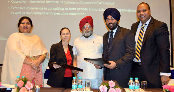 Share on Facebook Share on Twitter Share on Google+ Share on Pinterest Share on Linkedin Gian Jyoti Signed MoU with Australian University Nabaz-e-Punjab Bureau, Mohali, 21 October: Gian Jyoti Phase-2 Mohali has partnered with AIM Business School, Australia to launch its MBA program for working professionals, in India. The MoU is signed between Edge Career Solutions and AIM. Dean-AIM, Prof More and Director-AIM, Sisa Rasaku along with CEO-ECS, Sukhpreet Singh and Chairman-Gian Jyoti, JS Bedi launch the event of AIM MBA program. On this event, Prof More shared that the program is designed especially for working professionals whereby they can do MBA while doing their job and in order to complete its 12 units they can comfortably opt for its flexible learning model with tutorial support on weekends. The program is designed in due consultation with corporate and industry to meet their requirement. Director-AIM, Sisa Rasaku talked about AIM interest to launch this program in India as they see a huge potential in Indian professionals to grow in global market after doing their MBA. Chairman GJIMT J.S. Bed informed that GJIMT will strengthen this program by pooling in experienced faculty who will be taking the classes for students admitted in this program. This ensures the quality in delivery of Education. The program launch is seen by members from both industry and academia. Sukhpreet CEO ECS shared the uniqueness of this program as being among rare programs where assessment is also done in India. Doing Australian MBA in India reduces the cost by 4 times and also provides professionals the next leap in opting global careers especially in Australia.