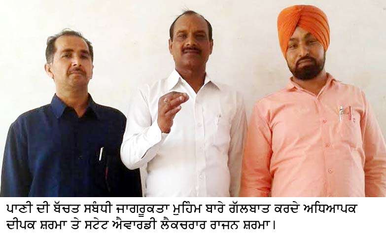 Share on Facebook Share on Twitter Share on Google+ Share on Pinterest Share on Linkedin ਸਰਕਾਰੀ ਅਧਿਆਪਕਾਂ ਦੀ ਪਾਣੀ ਬੱਚਤ ਮੁਹਿੰਮ ਰਹੀ ਬੇਹੱਦ ਸਫਲ ਰਜਨੀਕਾਂਤ ਗਰੋਵਰ ਨਬਜ਼-ਏ-ਪੰਜਾਬ ਬਿਊਰੋ, ਕੁਰਾਲੀ, 24 ਮਾਰਚ: ਪਾਣੀ ਦੀ ਹੋ ਰਹੀ ਕਮੀ, ਵਧਦੇ ਪ੍ਰਦੂਸ਼ਣ ਅਤੇ ਪਾਣੀ ਦੀ ਬਰਬਾਦੀ ਨੂੰ ਰੋਕਣ ਦੇ ਮੱਦੇਨਜ਼ਰ ਪੰਜਾਬ ਦੇ ਸਰਕਾਰੀ ਸਕੂਲਾਂ ਦੇ ਤਿੰਨ ਅਧਿਆਪਕਾਂ ਵੱਲੋਂ ਇਸ ਸਬੰਧੀ ‘‘ਵਿਸ਼ਵ ਧਰਤ ਦਿਵਸ’’ 2016 ਤੋਂ ਲੈ ਕੇ ‘ਵਿਸ਼ਵ ਜਲ ਦਿਵਸ’ 2017 ਤਕ ਸੋਸ਼ਲ ਮੀਡੀਆ ਰਾਹੀਂ ਪਾਣੀ ਬਚਾਓ ਸਬੰਧੀ ਇਕ ਮੁਹਿੰਮ ਚਲਾਈ ਗਈ ।ਜਿਸ ਦਾ ਵਿਸ਼ਵ ਜਲ ਦਿਵਸ ਮੌਕੇ ਸਫਲਤਾ ਪੂਰਵਕ ਸਮਾਪਤੀ ਸਮਾਰੋਹ ਕਰਵਾਇਆ ਗਿਆ। ਸ਼ਹਿਰ ਦੇ ਨਿਵਾਸੀ ਤੇ ਸਰਕਾਰੀ ਸੀਨੀਅਰ ਸੈਕੰਡਰੀ ਸਕੂਲ ਢੰਗਰਾਲੀ ਦੇ ਮਾਸਟਰ ਦੀਪਕ ਸ਼ਰਮਾ, ਲੈਕ. ਰਾਜਨ ਸ਼ਰਮਾ ਖੇੜੀ ਨੌਧ ਸਿੰਘ ਅਤੇ ਸਰਕਾਰੀ ਸੀਨੀਅਰ ਸੈਕੰਡਰੀ ਸਕੂਲ ਖਮਾਣੋਂ ਦੇ ਪੰਜਾਬੀ ਮਾਸਟਰ ਜਗਜੀਤ ਸਿੰਘ ਵੱਲੋਂ ਸਾਲ ਭਰ ਚਲਾਈ ਇਸ ਮੁਹਿੰਮ ਰਾਹੀਂ ਹਜਾਰਾਂ ਦੇ ਕਰੀਬ ਲੋਕਾਂ ਨੂੰ ਪਾਣੀ ਬੱਚਤ ਸਬੰਧੀ ਨਵੇਂ ਨਵਂੇ ਤਰੀਕੇ ਅਪਨਾਉਣ ਲਈ ਪ੍ਰੇਰਿਤ ਕੀਤਾ ਜਾਂਦਾ ਰਿਹਾ। ਇਸ ਮੌਕੇ ਜਗਜੀਤ ਸਿੰਘ, ਦੀਪਕ ਸ਼ਰਮਾ ਤੇ ਰਾਜਨ ਸ਼ਰਮਾ ਸਟੇਟ ਅਵਾਰਡੀ ਨੇ ਇਸ ਸਬੰਧੀ ਦੱਸਿਆ ਕਿ ਬਹੁਤ ਸਾਰੇ ਲੋਕਾਂ ਨੇ ਇਸ ਮੁਹਿੰਮ ਤੋਂ ਪ੍ਰਭਾਵਿਤ ਹੋ ਕੇ ਪਾਣੀ ਬਚਾਉਣ ਦੇ ਉਪਰਾਲੇ ਸ਼ੁਰੂ ਕੀਤੇ ਹਨ। ਸਰਕਾਰੀ ਅਧਿਆਪਕਾਂ ਵੱਲੋਂ ਚਲਾਈ ਇਸ ਮੁਹਿੰਮ ਨੂੰ ਸਰਕਾਰੀ, ਧਾਰਮਿਕ ਤੇ ਸਮਾਜਿਕ ਜੱਥੇਬੰਦੀਆਂ ਨੇ ਸਲਾਘਾਯੋਗ ਕਦਮ ਦਸਿਆ ਗਿਆ।