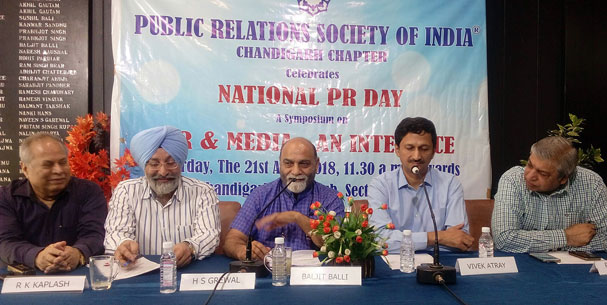 Share on Facebook Share on Twitter Share on Google+ Share on Pinterest Share on Linkedin PR personnel needs to be more responsive, alert and vigilant for successful professional approach A symposium on “PR & Media : An Interface” organized by PRSI Chandigarh Chapter on the occasion of 41st National PR Day Nabaz-e-Punjab Bureau, Chandigarh, 22 April: “Mutual relations between public relations practitioners and media are very old, warm, incomparable and resolute and complementary relations with each other are always beneficial for the society. In the modern era PR personnel will have to be more responsive, alert and punctual to exhibit their required performance for a successful professional approach”. These views were expressed by former IAS and eminent speaker Vivek Atray, senior journalist and editor of Babushahi news website Baljit Balli and P.K Khurana chairman of Quick Relations Pvt Ltd during a symposium organized by the Chandigarh chapter of Public Relations Society of India (PRSI) at the 41st National PR Day at the Chandigarh Press Club. Delivering thoughts during the symposium on “PR & Media : An Interface” the speakers were of the view that the with the increasing influence of social media and technological advancements, public relations personnel needs to be more acquainted with new developments and their feedback system should have to be more effective to survive in the fittest. While expressing his views Vivek Atray said exchange of information in the present era and habit of sharing the information earliest has increased the responsibility of media and PR manifold because the information given in a hurry is forwarded freely without taking the burden of being tested, verifiable or true. “So that both parties may have to take a risk in the event of wrong reporting of that information,” he added. Presenting his views, Baljit Balli said the scope of PR in comparison to media is more massive, multi-pronged and responsible whether it is being done by government or private PR agencies. He candidly said even journalists’ have to do PR while scouting for special stories in government offices but PR professionals are playing multi-pronged role at realm of every field. “And with the increasing trend of social media, duties of PR personnel have become responsible and more efficient than before,” he stressed. During deliberations, P.K. Khurana has clearly stated that PR personnel were never a part of anti media and nor has been working to hide any information by concealing the facts. “Even PR people have been closely working with media as a bridge to propagate the information for the general public by becoming a supplement and a collaborator of the media,” he added. In his inaugural address PRSI, Chandigarh Chapter Chairman Harjeet Singh Grewal Deputy Director Punjab PR department announced that the chapter would be present ‘best public relations practitioner’, ‘best public relations agency’ and ‘best public relations teacher’ as annual awards from next PR day onwards. PRSI vice chairman K.R. Kaplash thanked everyone. On the occasion PRSI Chandigarh Chapter has also organised its annual general meeting in which progress report and accounts of the last two years have been presented. It was also decided to appoint returning officer and assistant returning officer for its ensuing general elections to be held in June this.