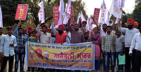 Share on Facebook Share on Twitter Share on Google+ Share on Pinterest Share on Linkedin ਨੌਜਵਾਨ ਸਭਾ ਨੇ ਨੌਜਵਾਨਾਂ ਨਾਲ ਕੀਤੇ ਵਾਅਦੇ ਲਾਗੂ ਕਰਾਉਣ ਲਈ ਰੋਸ ਮਾਰਚ ਕੱਢਿਆ ਨਬਜ਼-ਏ-ਪੰਜਾਬ ਬਿਊਰੋ, ਮੁਹਾਲੀ, 22 ਮਾਰਚ: ਕੈਪਟਨ ਸਰਕਾਰ ਵੱਲੋਂ ਨੌਜਵਾਨਾਂ ਨਾਲ ਕੀਤੇ ਵਾਅਦਿਆਂ ਨੂੰ ਲਾਗੂ ਕਰਾਉਣ ਲਈ ਸ਼ਹੀਦ ਭਗਤ ਸਿੰਘ ਨੌਜਵਾਨ ਸਭਾ ਅਤੇ ਪੰਜਾਬ ਸਟੂਡੈਂਟਸ ਫੈਡਰੇਸ਼ਨ (ਪੀ.ਐਸ.ਐਫ.) ਦੇ ਸੱਦੇ ਤੇ ਇਕੱਤਰ ਹੋਏ ਨੌਜਵਾਨਾਂ ਵਲੋੱ ਫੇਜ 8 ਵਿੱਚੋੱ ਚੰਡੀਗੜ੍ਹ ਵੱਲ ਮਾਰਚ ਕੀਤਾ। ਸ਼ਹੀਦ ਭਗਤ ਸਿੰਘ, ਰਾਜਗੁਰੂ, ਸੁਖਦੇਵ ਦੇ ਸ਼ਹੀਦੀ ਦਿਨ ਨੂੰ ਸਮਰਪਿਤ ਇਸ ਮਾਰਚ ਵਿੱਚ ਨੌਜਵਾਨਾਂ ਨੇ ਭਗਤ ਸਿੰਘ ਦੀ ਫੋਟੋ ਵਾਲੇ ਝੰਡੇ, ਬੈਨਰ ਅਤੇ ਮੰਗਾਂ ਸਬੰਧੀ ਤਖਤੀਆਂ ਹੱਥਾਂ ਵਿੱਚ ਫੜੀਆਂ ਹੋਈਆਂ ਸਨ। ਇਸ ਮੌਕੇ ਸੰਬੋਧਨ ਕਰਦਿਆਂ ਸਭਾ ਦੇ ਜਨਰਲ ਸਕੱਤਰ ਸ਼ਮਸ਼ੇਰ ਸਿੰਘ ਬਟਾਲਾ ਨੇ ਕਿਹਾ ਕਿ ਪੰਜਾਬ ਦੀ ਕੈਪਟਨ ਸਰਕਾਰ ਬਣੀ ਨੂੰ ਇਕ ਸਾਲ ਦਾ ਸਮਾਂ ਹੋ ਗਿਆ ਹੈ। ਨੌਜਵਾਨਾਂ ਨਾਲ ਚੋਣਾਂ ਸਮੇੱ ਕੀਤੇ ਵਾਅਦਿਆਂ ਤੇ ਬਿਲਕੁਲ ਹੀ ਅਮਲ ਨਹੀਂ ਕੀਤਾ ਗਿਆ। ਬਲਕਿ ਸਰਕਾਰੀ ਥਰਮਲ ਪਲਾਂਟ ਬੰਦ ਕਰਕੇ, 800 ਸਰਕਾਰੀ ਸਕੂਲਾਂ ਨੂੰ ਪੱਕੇ ਤਾਲੇ ਲਾ ਕੇ, ਆਂਗਣਵਾੜੀ ਸਕੂਲ ਬੰਦ ਕਰਕੇ ਬੇਰੁਜ਼ਗਾਰੀ ਵਿੱਚ ਵਾਧਾ ਕੀਤਾ ਗਿਆ ਹੈ। ਉਨ੍ਹਾਂ ਕਿਹਾ ਕਿ ਕੇੱਦਰ ਦੀ ਨਰਿੰਦਰ ਮੋਦੀ ਦੀ ਸਰਕਾਰ ਅਤੇ ਕੈਪਟਨ ਦੀ ਸਰਕਾਰ ਦੀਆਂ ਨੀਤੀਆਂ ਵਿੱਚ ਕੋਈ ਅੰਤਰ ਨਹੀੱ। ਦੋਹਾਂ ਦੀਆਂ ਨੀਤੀਆਂ ਨਿੱਜੀਕਰਨ ਦੇ ਹੱਕ ਵਿੱਚ ਹਨ। ਇਸ ਮੌਕੇ ਪੰਜਾਬ ਸਟੂਡੈਂਟਸ ਫੈਡਰੇਸ਼ਨ ਦੇ ਜਨਰਲ ਸਕੱਤਰ ਅਜੈ ਫਿਲੌਰ ਨੇ ਕਿਹਾ ਕਿ ਕੈਪਟਨ ਸਰਕਾਰ ਦੀਆਂ ਵਿਦਿਆਰਥੀ ਵਿਰੋਧੀ ਨੀਤੀਆਂ ਨੇ ਗਰੀਬ ਵਰਗ ਦੇ ਬੱਚਿਆਂ ਕੋਲੋੱ ਵਿਦਿਆ ਖੋਹ ਕੇ ਅਮੀਰ ਲੋਕਾਂ ਦੇ ਹੱਥ ਵਿੱਚ ਦੇ ਦਿੱਤੀ ਹੈ। ਉਨ੍ਹਾਂ ਕਿਹਾ ਕਿ ਵਿਦਿਆ ਦਾ ਨਿਜੀਕਰਨ, ਵਪਾਰੀਕਰਨ ਕਰਕੇ ਹਜ਼ਾਰਾਂ ਸਰਕਾਰੀ ਸਕੂਲ/ਕਾਲਜ ਟੀਚਰਾਂ ਤੋਂ ਵਾਂਝੇ ਕਰ ਦਿੱਤੇ ਹਨ। ਇਸ ਮੌਕੇ ਮਨਦੀਪ ਕੌਰ ਸ਼ੱਕਰੀ, ਸੁਰਜੀਤ ਸਿੰਘ ਦੁਧਰਾਏ, ਮੱਖਣ ਸੰਗਰਾਮੀ, ਗੁਰਦੀਪ ਬੇਗਮਪੁਰ, ਹਰਨੇਕ ਗੁਜਰਵਾਲ, ਦਲਵਿੰਦਰ ਕੁਲਾਰ, ਸੁਰੇਸ਼ ਸਮਾਣਾ, ਜਤਿੰਦਰ ਫਰੀਦਕੋਟ, ਸਿਮਰਜੀਤ ਬਰਾੜ, ਬੰਸੀ ਲਾਲ, ਸੰਦੀਪ ਮਾਨਸਾ, ਤਸਵੀਰ ਖਿਲਚੀਆਂ, ਸੁਖਦੇਵ ਜਵੰਦਾ, ਕਰਮਬੀਰ ਪੱਖੋਕੇ, ਰਮਨਦੀਪ ਘਨੌਰ, ਸਤਨਾਮ ਸੁੱਜੋ, ਪ੍ਰਭਾਤ ਕਵੀ, ਸੰਦੀਪ ਸਿੰਘ ਤੋ ਇਲਾਵਾ ਵੱਡੀ ਗਿਣਤੀ ਨੌਜਵਾਨ-ਵਿਦਿਆਰਥੀ ਹਾਜ਼ਰ ਸਨ।