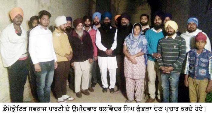 ਮੁਹਾਲੀ ਤੋਂ ਡੈਮੋਕ੍ਰੇਟਿਕ ਸਵਰਾਜ ਪਾਰਟੀ ਦੇ ਉਮੀਦਵਾਰ ਬਲਵਿੰਦਰ ਸਿੰਘ ਕੁੰਭੜਾ ਨੇ ਆਪਣੀ ਚੋਣ ਸਰਗਰਮੀਆਂ ਤੇਜ਼ ਕਰਦਿਆਂ ਅੱਜ ਇੱਥੋਂ ਦੇ ਨੇੜਲੇ ਪਿੰਡ ਚੱਪੜਚਿੜੀ, ਲਾਂਡਰਾਂ, ਕੈਲੋਂ ਅਤੇ ਗੋਬਿੰਦਗੜ੍ਹ ਵਿੱਚ ਨੁੱਕੜ ਮੀਟਿੰਗਾਂ ਕਰਕੇ ਲੋਕਾਂ ਤੋਂ ਵੋਟਾਂ ਮੰਗੀਆਂ। ਉਨ੍ਹਾਂ ਦੋਸ਼ ਲਾਇਆ ਕਿ ਅਕਾਲੀ-ਭਾਜਪਾ ਗੱਠਜੋੜ ਅਤੇ ਕਾਂਗਰਸ ਪਾਰਟੀ ਦੇ ਆਗੂ ਪਿਛਲੇ ਕਈ ਦਹਾਕਿਆਂ ਤੋਂ ਲੋਕਾਂ ਦੀਆਂ ਉਮੀਦਾਂ ’ਤੇ ਖਰੇ ਨਹੀਂ ਉਤਰੇ ਹਨ ਲੇਕਿਨ ਵਿਧਾਨ ਸਭਾ ਚੋਣਾਂ ਵੇਲੇ ਇਨ੍ਹਾਂ ਆਗੂਆਂ ਨੂੰ ਲੋਕ ਮਸਲੇ ਚੇਤੇ ਆ ਜਾਂਦੇ ਹਨ।