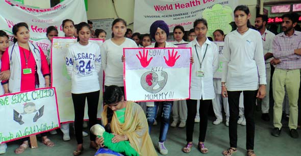 Share on Facebook Share on Twitter Share on Google+ Share on Pinterest Share on Linkedin ਯੂਨੀਵਰਸਲ ਗਰੁੱਪ ਨੇ ਧੂਮਧਾਮ ਨਾਲ ਮਨਾਇਆ ਵਿਸ਼ਵ ਸਿਹਤ ਦਿਵਸ ਲੋਕਾਂ ਨੂੰ ਆਪਣੀ ਸਿਹਤ ਪ੍ਰਤੀ ਜਾਗਰੂਕ ਹੋਣਾ ਸਮੇਂ ਦੀ ਮੁੱਖ ਲੋੜ: ਡਾ. ਗੁਰਪ੍ਰੀਤ ਸਿੰਘ ਨਬਜ਼-ਏ-ਪੰਜਾਬ ਬਿਊਰੋ, ਲਾਲੜੂ, 7 ਅਪਰੈਲ: ਸਿੱਖਿਆ ਦੇ ਖੇਤਰ ਵਿੱਚ ਮੋਹਰੀ ਯੂਨੀਵਰਸਲ ਗਰੁੱਪ ਵੱਲੋਂ ਵਿਸ਼ਵ ਸਿਹਤ ਦਿਵਸ ਬੜੀ ਧੂਮਧਾਮ ਨਾਲ ਮਨਾਇਆ ਗਿਆ। ਇਸ ਦੌਰਾਨ ਗਰੁੱਪ ਦੇ ਵਿਦਿਆਰਥੀਆਂ ਵੱਲੋਂ ਵੱਖ-ਵੱਖ ਭਾਗਾਂ ਵਿੱਚ ਰੈਲੀਆਂ ਕੱਢੀਆਂ ਗਈਆਂ। ਪਹਿਲੀ ਰੈਲੀ ਵਿਦਿਆਰਥੀਆਂ ਵੱਲੋਂ ਲਾਲੜੂ ਸਥਿਤ ਕਾਲਜ ਕੈਂਪਸ ਤੋਂ ਗੌਰਮਿੰਟ ਹਸਪਤਾਲ, ਲਾਲੜੂ ਤੱਕ ਕੱਢੀ ਗਈ। ਜਦੋਂਕਿ ਦੂਜੀ ਰੈਲੀ ਡੇਰਾਬਸੀ ਹਸਪਤਾਲ ਤੋਂ ਕੱਢੀ ਗਈ। ਇਸ ਮੌਕੇ ਵਿਦਿਆਰਥੀਆਂ ਨੇ ਨੱੁਕੜ ਨਾਟਕ ਖੇਡ ਕੇ ਲੋਕਾਂ ਨੂੰ ਵਿਸ਼ਵ ਸਿਹਤ ਦਿਵਸ ਮਨਾਉਣ ਦੇ ਉਦੇਸ਼ ਬਾਰੇ ਜਾਣਕਾਰੀ ਦਿੱਤੀ। ਵਿਦਿਆਰਥੀਆਂ ਨੇ ਰੈਲੀ ਦੌਰਾਨ ਸਮਾਜ ਵਿੱਚ ਫੈਲ ਰਹੀਆਂ ਬਿਮਾਰੀਆਂ ਜਿਵੇਂ ਬੰਦ ਕਰੋ ਪੋਲੀਓ ਟੀਕਾਕਰਨ ਕਰੋ, ਸਫ਼ਾਈ ਅਪਣਾਓ ਬਿਮਾਰੀਆਂ ਹਟਾਓ, ਬੀ ਫੇਅਰ ਡੋਂਟ ਪੋਲਊਟ ਦਾ ਏਅਰ, ਬੇਟੀ ਬਚਾਓ, ਆਓ ਮਿਲ ਕੇ ਅਭਿਆਨ ਚਲਾਈਏ ਤੰਬਾਕੂ ਮੁਕਤ ਦੇਸ਼ ਬਣਾਈਏ ਆਦਿ ਵਿਸ਼ਿਆਂ ਦੇ ਨਾਲ ਸੰਬੰਧਤ ਸਲੋਗਨ ਹੱਥ ਵਿਚ ਫੜੇ ਹੋਏ ਸਨ। ਯੂਨੀਵਰਸਲ ਕਾਲਜ ਦੇ ਵਿਦਿਆਰਥੀਆਂ ਨੇ ਇਸ ਦੋਰਾਨ ਲੋਕਾਂ ਨੂੰ ਚੰਗੀ ਸਿਹਤ, ਖਾਣ-ਪੀਣ ਦੇ ਚੰਗੇ ਅਸੂਲ, ਜੀਵਨ ਵਿੱਚ ਪਾਣੀ ਅਤੇ ਦਰੱਖਤਾਂ ਦੀ ਮਹੱਤਤਾ ਅਤੇ ਬੀਮਾਰੀਆਂ ਤੋਂ ਬਚਾਓ ਲਈ ਵਰਤੀਆਂ ਜਾਣ ਵਾਲੀਆਂ ਸਾਵਾਧਾਨੀਆਂ ਬਾਰੇ ਜਾਣੂ ਕਰਵਾਇਆ। ਇਸ ਮੌਕੇ ਵਿਦਿਆਰਥੀਆਂ ਨੂੰ ਸੰਬੋਧਨ ਕਰਦੇ ਹੋਏ ਯੂਨੀਵਰਸਲ ਕਾਲਜ ਦੇ ਚੇਅਰਮੈਨ ਡਾ. ਗੁਰਪ੍ਰੀਤ ਸਿੰਘ ਨੇ ਕਿਹਾ ਕਿ ਵਿਸ਼ਵ ਸਿਹਤ ਦਿਵਸ ਦਾ ਮੱੁਖ ਮਕਸਦ ਲੋਕਾਂ ਨੂੰ ਆਪਣੀ ਸਿਹਤ ਬਾਰੇ ਜਾਗਰੂਕ ਕਰਨਾ ਹੈ। ਸਾਨੂੰ ਸਿਹਤ ਉੱਪਰ ਮਾੜਾ ਪ੍ਰਭਾਵ ਪਾਉਣ ਵਾਲੀਆਂ ਖਾਣ-ਪੀਣ ਦੀਆਂ ਚੀਜ਼ਾਂ ਤੋਂ ਗੁਰੇਜ਼ ਕਰਨਾ ਚਾਹੀਦਾ ਹੈ। ਉਨ੍ਹਾਂ ਕਿਹਾ ਕਿ ਤੰਦਰੁਸਤੀ ਜੀਵਨ ਵਿੱਚ ਸਾਰੀਆਂ ਖੁਸ਼ੀਆਂ ਦਾ ਆਧਾਰ ਹੈ, ਇਸ ਲਈ ਹਰੇਕ ਮਨੁੱਖ ਨੂੰ ਚੰਗੇ ਖਾਣ-ਪੀਣ, ਸਾਫ-ਸਫਾਈ ਅਤੇ ਕਸਰਤ ਨਾਲ ਸਰੀਰ ਨੂੰ ਤੰਦਰੁਸਤ ਬਣਾਈ ਰੱਖਣ ਦੇ ਯਤਨ ਕਰਨੇ ਚਾਹੀਦੇ ਹਨ। ਇਸ ਮੌਕੇ ਐਸਐਮਓ ਡਾ. ਸੰਗੀਤਾ ਜੈਨ ਨੇ ਵਿਦਿਅਰਥੀਆਂ ਵੱਲੋਂ ਕੀਤੀ ਗਈ ਗਤੀਵਿਧੀਆਂ ਦੀਆਂ ਦੀ ਸ਼ਲਾਘਾ ਕੀਤੀ।